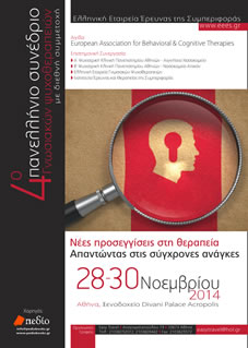Η Ελληνική Εταιρεία Έρευνας Συμπεριφοράς σε συνεργασία με την Α Ψυχιατρική Κλινική Πανεπιστημίου Αθηνών, τη Β Ψυχιατρική Κλινική Πανεπιστημίου Αθηνών και το Ινστιτούτο Έρευνας και Θεραπείας της Συμπεριφοράς διοργανώνουν το 4ο Πανελλήνιο Συνέδριο Γνωσιακών Ψυχοθεραπειών τον ερχόμενο Νοέμβριο στην Αθήνα.