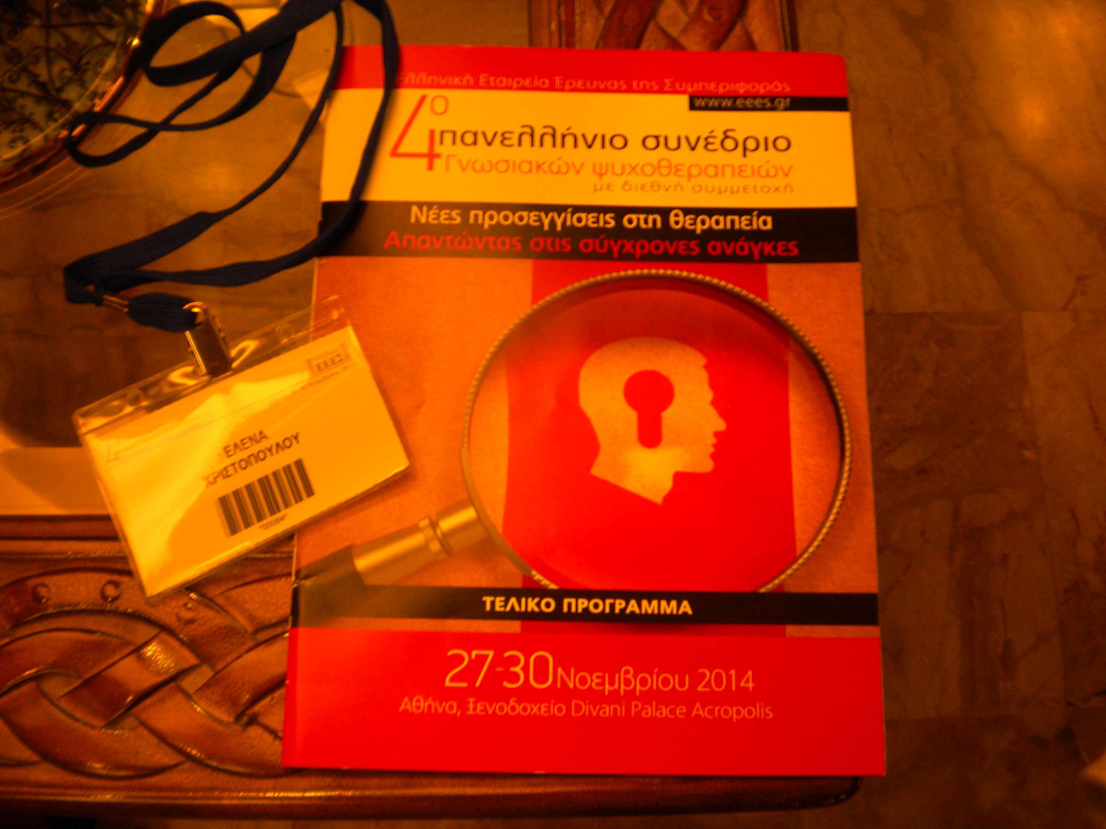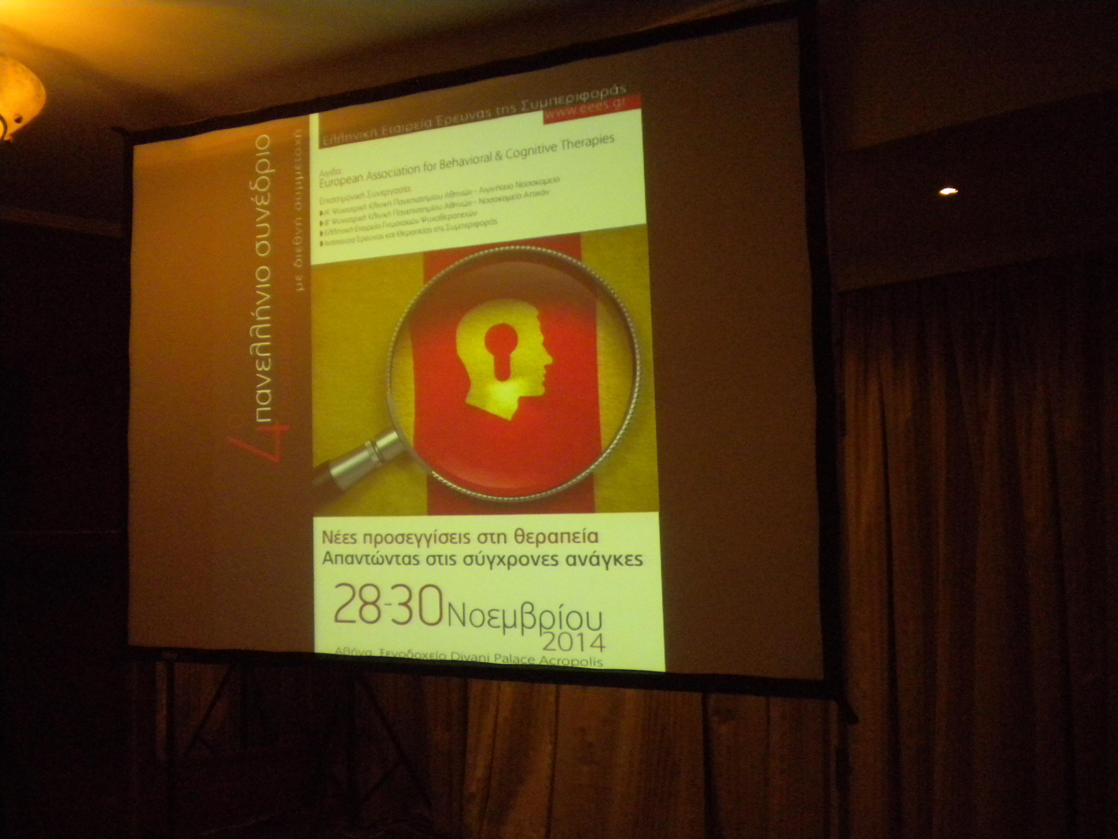 Το 4ο πανελλήνιο συνέδριο γνωσιακών ψυχοθεραπειών ολοκλήρωσε με μεγάλη επιτυχία τις εργασίες του το βράδυ της Κυριακής 30 Νοεμβρίου. Ήταν ένα συνέδριο με μεγάλη συμμετοχή συνέδρων, με πλούσια θεματολογία και ποικιλία εργαστηρίων και ελεύθερων ανακοινώσεων. Συγχαρητήρια τόσο στην εταιρεία που διοργάνωσε το Συνέδριο όσο και στο ξενοδοχείο που φιλοξένησε τις παρουσιάσεις.