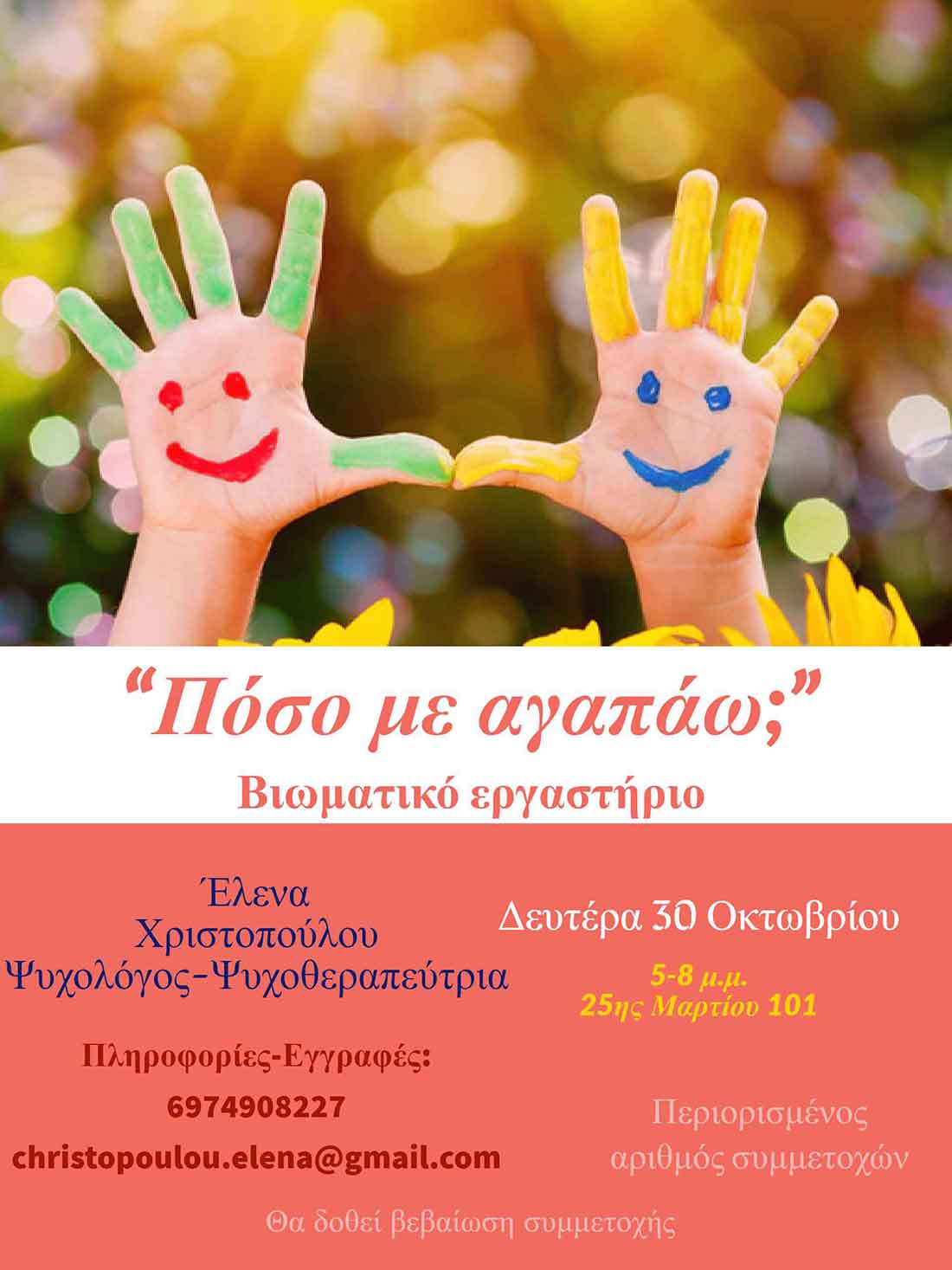 Το εργαστήριο θα διεξαχθεί τη Δευτέρα 30 Οκτωβρίου στις 5.00 μ.μ. στο χώρο μου (25ης Μαρτίου 101) και θα έχει διάρκεια 3 ωρών. Στο τέλος του σεμιναρίου θα δοθεί βεβαίωση παρακολούθησης στους συμμετέχοντες. Ο αριθμός των συμμετεχόντων, λόγω του βιωματικού χαρακτήρα του εργαστηρίου, θα είναι περιορισμένος.